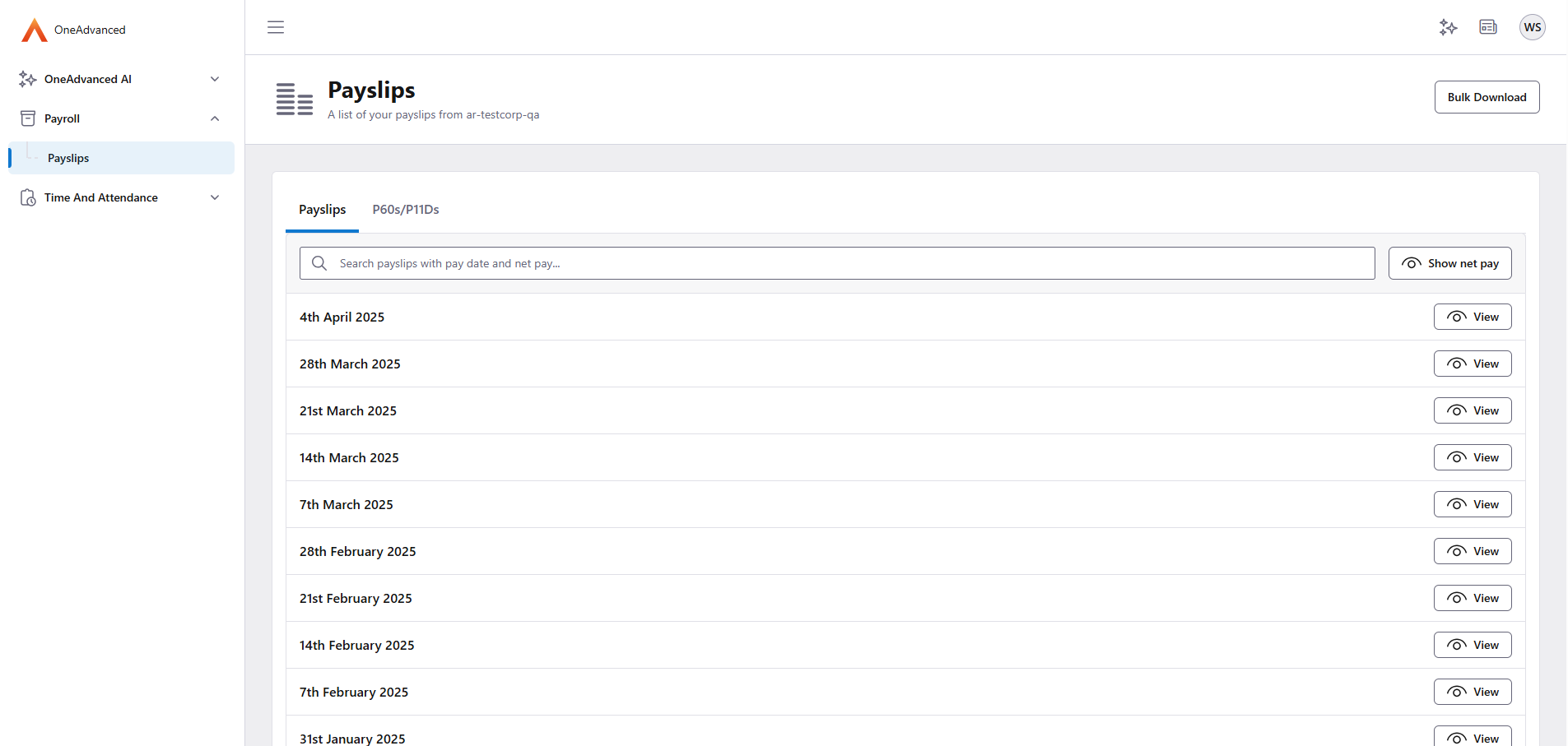 From within the Payslips section you can see the payrolls that have been processed, along with the net pay for each payroll: