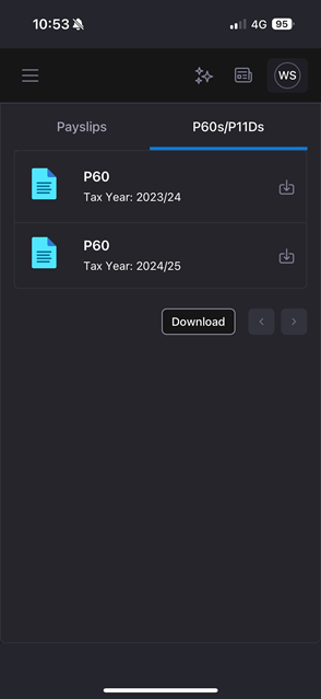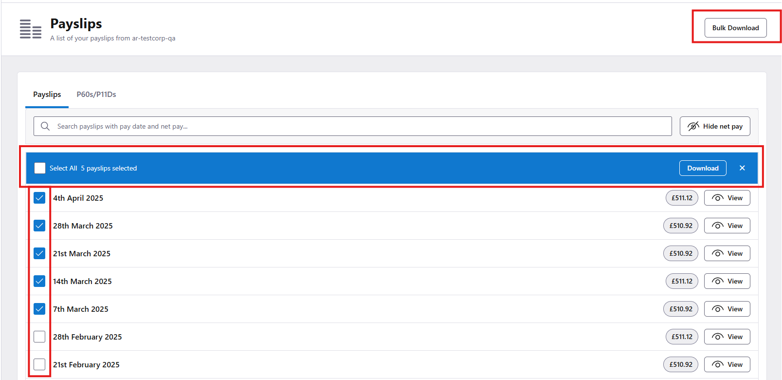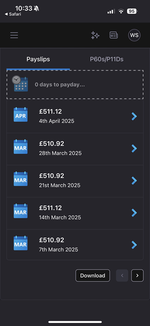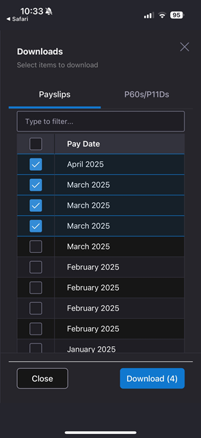 Clicking the Download button at the bottom allows you to select which payslips you want to download to your device: