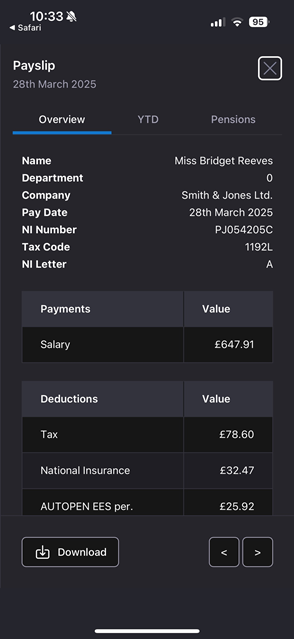Clicking on an individual payslip card will take you to a similar on screen rendering of the payslip information as per the web app, where you can navigate between the Payslip Overview, Year to Date and Pensions tab, as well as Download each payslip individually: