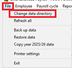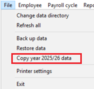 To Copy the data file select File in the top left of the Payroll application, then select Copy year 2025/26 data.