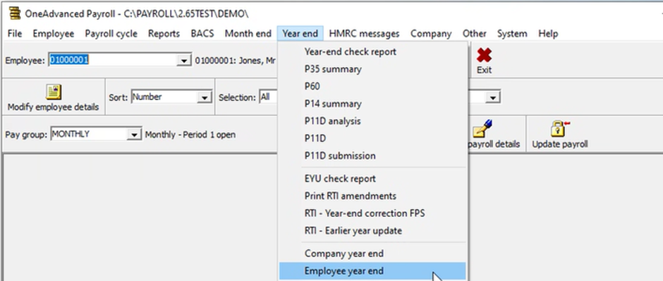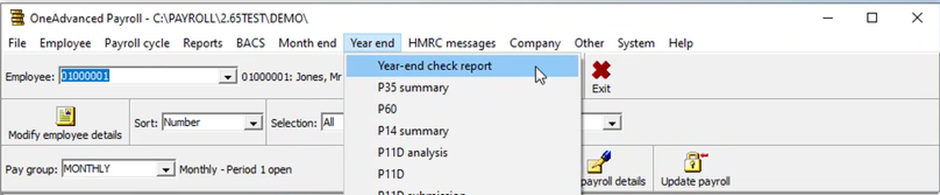 To generate a P60, select P60 from the Year-end menu in the Payroll toolbar: