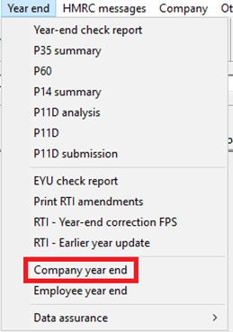 Select the Year-end menu on the Payroll toolbar and then select Company year-end from the dropdown menu.