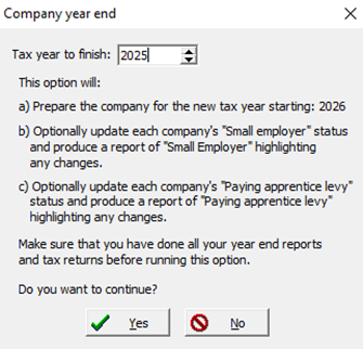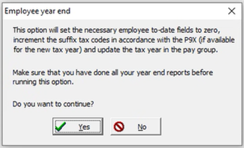 This will open a new window which will ask you to confirm that you want to carry on with the Employee year-end process. Click Yes to continue.