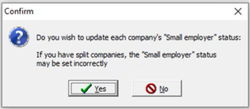 This gives you the option of updating your small employer status. Click Yes to allow Payroll to determine each company’s Small employer status, or No to omit this process.