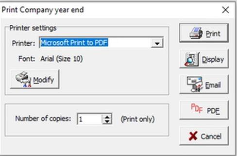 After you pick Yes or No, a form will be displayed. This allows the user to choose to print, display, email or create a PDF of the company year-end report: