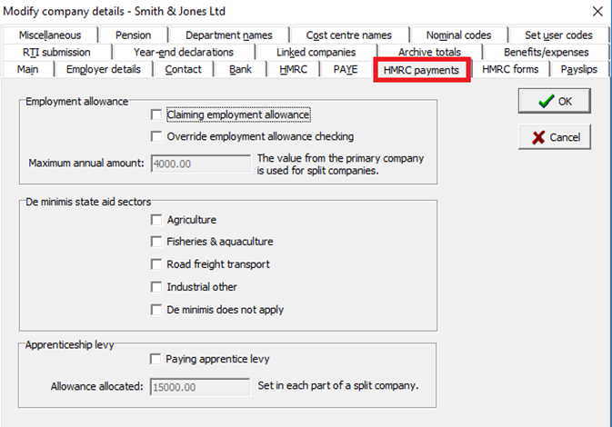 Next, select a split company and click modify. Proceed to the HMRC Payments tab and ensure the employment allowance fields are correct.